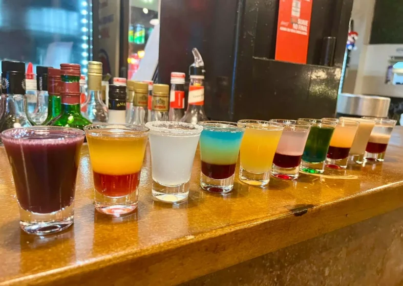 Arco-íris – vodka, laranja, xarope de grenadine e curaçao blue; Fire – Steinhaeger, mel e curaçao blue; Bombeirinho – cachaça, xarope de grenadine e limão; Sunrise – vodka, laranja e xarope de grenadine; Chilli – Steinhaeger, pimenta, maracujá e xarope de melancia; e Cérebro – vodka, xarope de morango e marula.