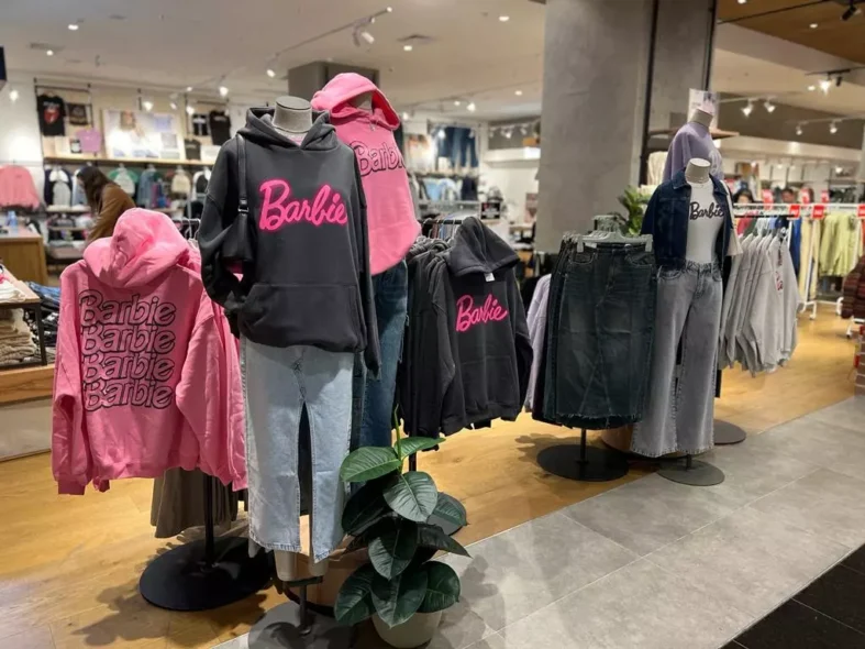 A Cotton On tem uma linha especial licenciada da Barbie, com moletons, saias jeans, calças jeans, camisetas e jaquetas. O cor-de-rosa predomina, mas a coleção também tem peças em lilás e cinza, para um look cheio de estilo.