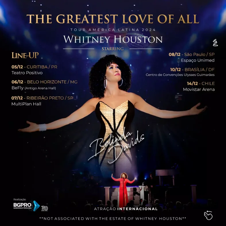 Neste ano, o filme “O Guarda-Costas”, estrelado por Whitney Houston, completa 32 anos, e as canções que marcaram essa história continuam vivas na memória de milhões. Belinda não apenas interpreta os sucessos de Whitney – ela revive a essência da artista. Cada apresentação é uma experiência única, marcada pela entrega emocional e pela capacidade de se conectar profundamente com o público. Músicas como “I Will Always Love You”, “Greatest Love of All” e “I Wanna Dance with Somebody” são trazidas à vida de forma emocionante.