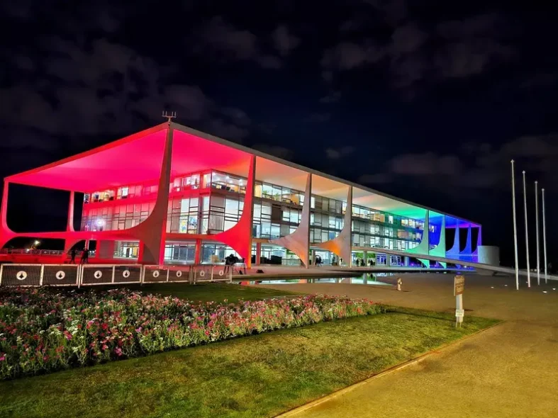 Intervenção artística histórica. A pedido do Brasília Orgulho, a sede do Poder Executivo federal coloriu-se de arco-íris pela primeira vez.