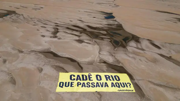 No chão seco do Rio Solimões, no Amazonas – dados da Defesa Civil mostram que o Solimões está baixando entre 20 cm a 30 cm por dia – ativistas amazônidas do Greenpeace estenderam um banner gigantesco com a mensagem: “Cadê o rio que passava aqui?“. Alguns trechos importantes do rio Solimões (Tabatinga, Fonte Boa e Coari), uma das bacias do Rio Amazonas, o nível do rio já é o mais baixo da história.