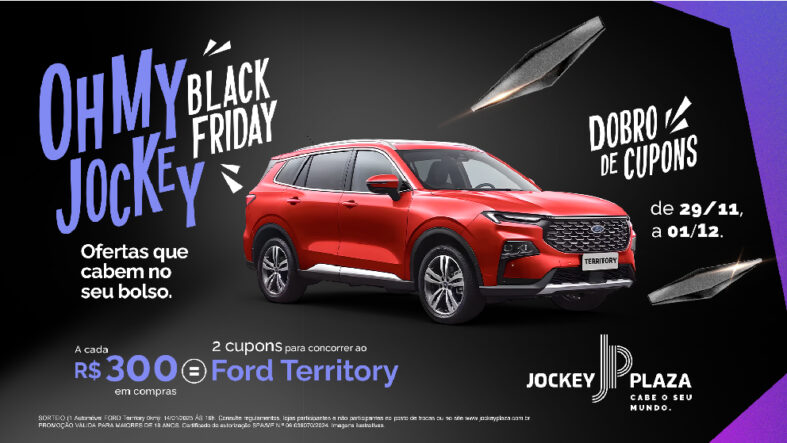 O Jockey Plaza Shopping realiza, de 29 de novembro a 1º de dezembro, a sexta edição da Oh My Jockey, com descontos de até 70% nas lojas participantes. Com diversas opções de compras, como moda feminina, masculina e infantil, acessórios, calçados, perfumaria, cosméticos, brinquedos, games, eletrônicos e eletrodomésticos, o shopping todo funciona em horário estendido: nos dias 29 e 30 (sexta e sábado), as lojas e operações de alimentação abrem das 10h às 23h e, no domingo, dia 1º, as lojas funcionam das 12h às 20h e a alimentação, das 11h às 22h.