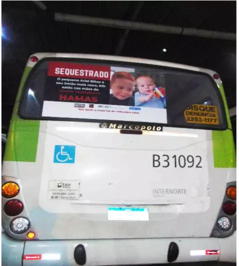 Foto: Vidros traseiros de trinta ônibus com imagens dos reféns. Objetivo é conscientizar a sociedade sobre as atrocidades realizadas pelo grupo terrorista Hamas.