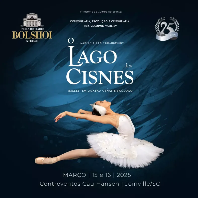 Em comemoração aos 25 anos da Escola do Teatro Bolshoi no Brasil, nos dias 15 e 16 de março de 2025, às 19h30, no Centreventos Cau Hansen, em Joinville/SC, o público terá a oportunidade única de assistir ao icônico balé O Lago dos Cisnes em uma produção exclusiva. Com coreografia e cenografia assinadas pelo lendário Vladimir Vasiliev, um dos maiores nomes do balé do século XX, esta montagem promete encantar e emocionar.