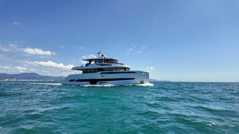 Luxuoso, versátil, imponente e, ao mesmo tempo, com um estilo único “aventureiro”, a embarcação traz uma série de inovações. Entre elas, o amplo salão principal (convés), que é dedicado exclusivamente para lazer e convivência com áreas para refeições e bem-estar. Nesse ambiente, cercado por vidros, quando abertos, se conectam às varandas laterais (estas que também podem ser abertas por meio de acionamento automático). O resultado é um impressionante espaço de mais de 120 m² concebido pelo fundador da marca, o empresário Nercio Fernandes, apaixonado pelo mundo das águas, em conjunto com o designer italiano, Paolo Ferragni, para aproveitar ao máximo a vida a bordo. O iate que já era sucesso mundial agora chega ao mercado com sua nova versão.