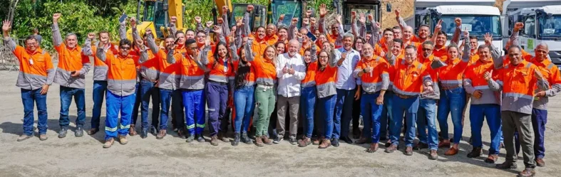 Lula com trabalhadores da ferrovia Oeste-Leste e o governador da Bahia, Jerônimo Rodrigues, em Ilhéus. Foto: Ricardo Stuckert / PR