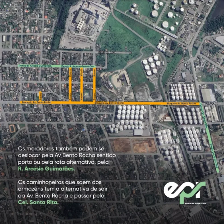 Neste período também estará bloqueado o acesso da avenida Bento Rocha às ruas: Carlos Fonseca Araújo, Dídio Costa, Sgt. Ismael F. Silva e Odilon Mader. A recomendação é que os moradores se desloquem pela região acessando a avenida Bento Rocha em direção ao Porto de Paranaguá ou pela rua Arcésio Guimarães (paralela à avenida).