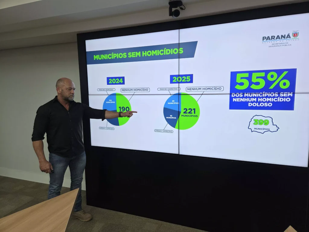 55% DAS CIDADES SEM HOMICÍDIOS – A melhora nos índices de violência letal também se reflete no aumento do número de municípios paranaenses sem homicídios dolosos. No primeiro semestre de 2024, eram 192 cidades sem registro desse tipo de crime. Em 2025, o número subiu para 221, o que representa 55% dos municípios do Paraná. Em outras 93 cidades (23%) só houve um caso registrado.