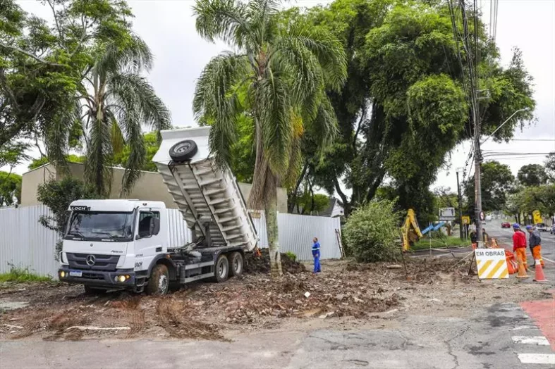 Equipes coordenadas pelo Departamento de Pontes e Drenagem da Secretaria Municipal de Obras Públicas (Smop) trabalham na substituição de uma tubulação de grande porte na Rua Castro, próximo à Rua Pedro Baggio, no bairro Água Verde.