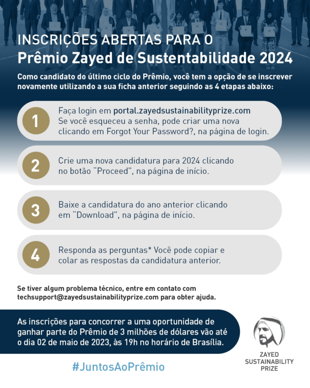 O Prêmio Zayed de Sustentabilidade, prêmio global pioneiro dos Emirados Árabes Unidos que reconhece a excelência em sustentabilidade, está com as inscrições abertas para o ciclo de 2024. As inscrições serão aceitas até dia 2 de maio de 2023 e podem ser feitas no portal oficial do Prêmio, em inglês.