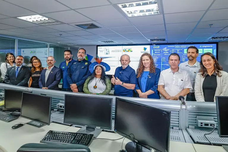 O presidente Lula e comitiva ministerial durante visita à sala de situação do "Enem dos Concursos", em Brasília. Foto: Ricardo Stuckert / PR