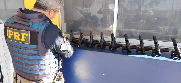 Na quinta (11), policiais rodoviários federais, em fiscalização a um ônibus intermunicipal, na BR-277, em Santa Terezinha de Itaipu (PR), encontraram, com uma passageira de 56 anos, 11 pistolas de fabricação turca, 50 munições de calibre 9 mm e nove carregadores.