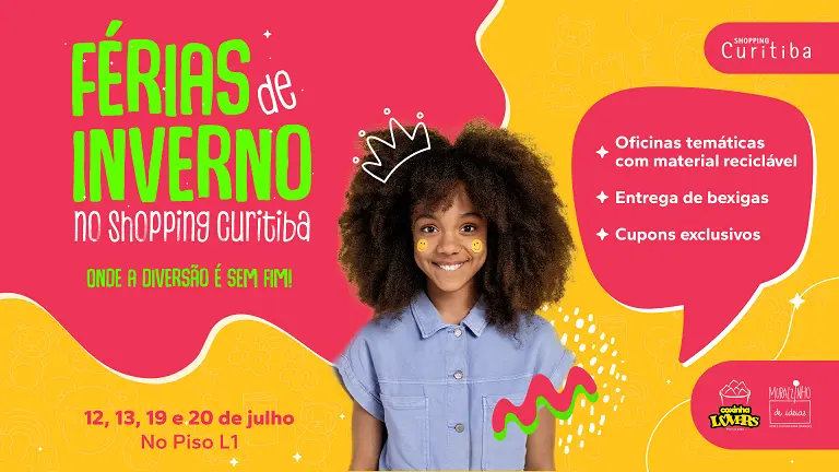 O Shopping Curitiba preparou uma agenda especial para as férias escolares de inverno. Nos dias 12, 13, 19 e 20 de julho, os pequenos poderão soltar a imaginação em oficinas que misturam arte, diversão e sustentabilidade. As atividades serão temáticas, utilizarão material reciclável, e acontecerão das 14h às 17h, no Piso L1. As inscrições são gratuitas e podem ser feitas na hora. Confira a programação.