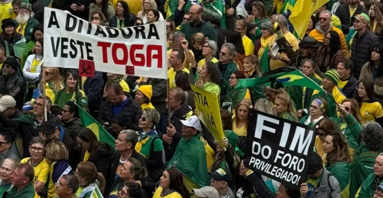 O ex-presidente Jair Bolsonaro citou as mulheres condenadas com penas elevadas pelo Supremo. E tentou falar em inglês para dizer…